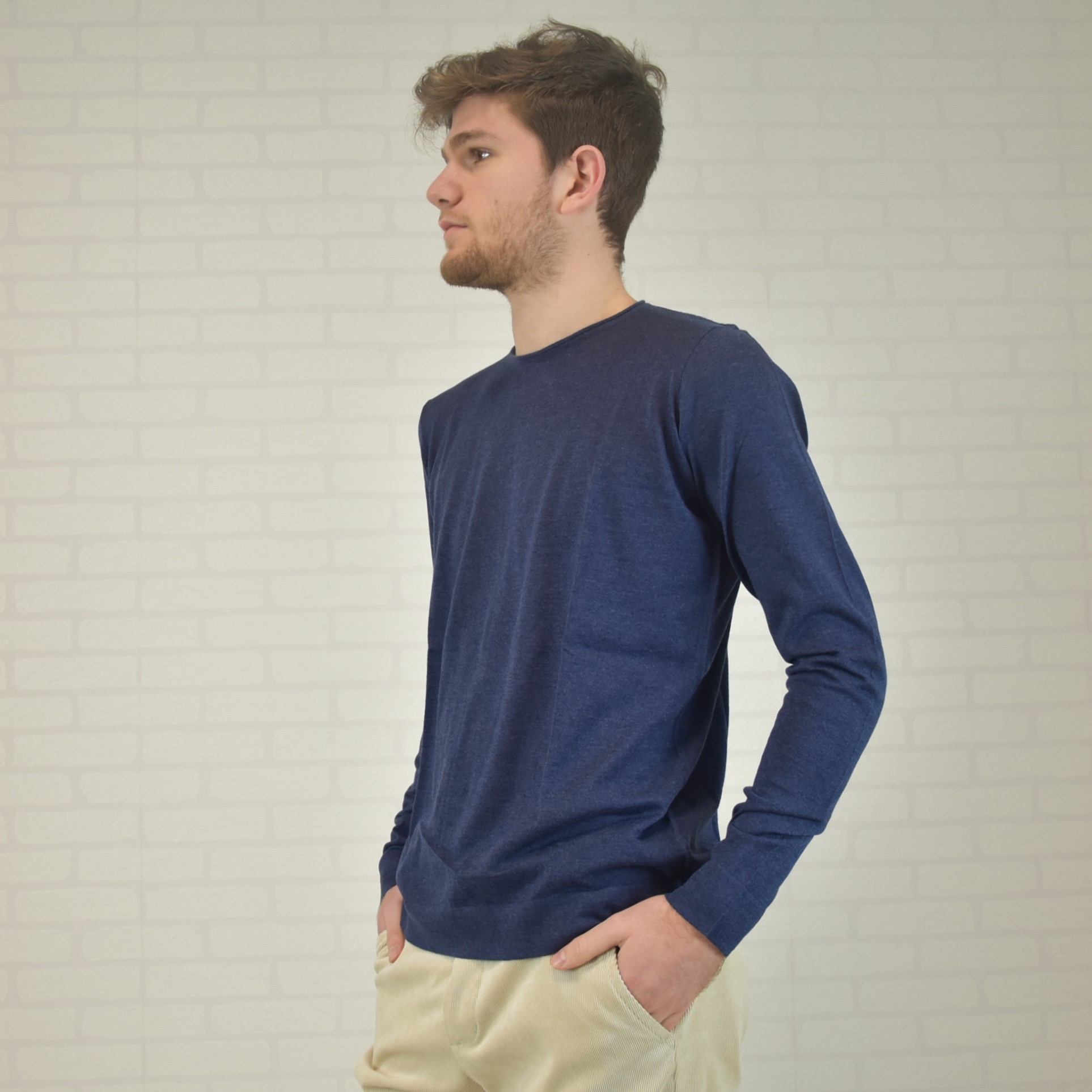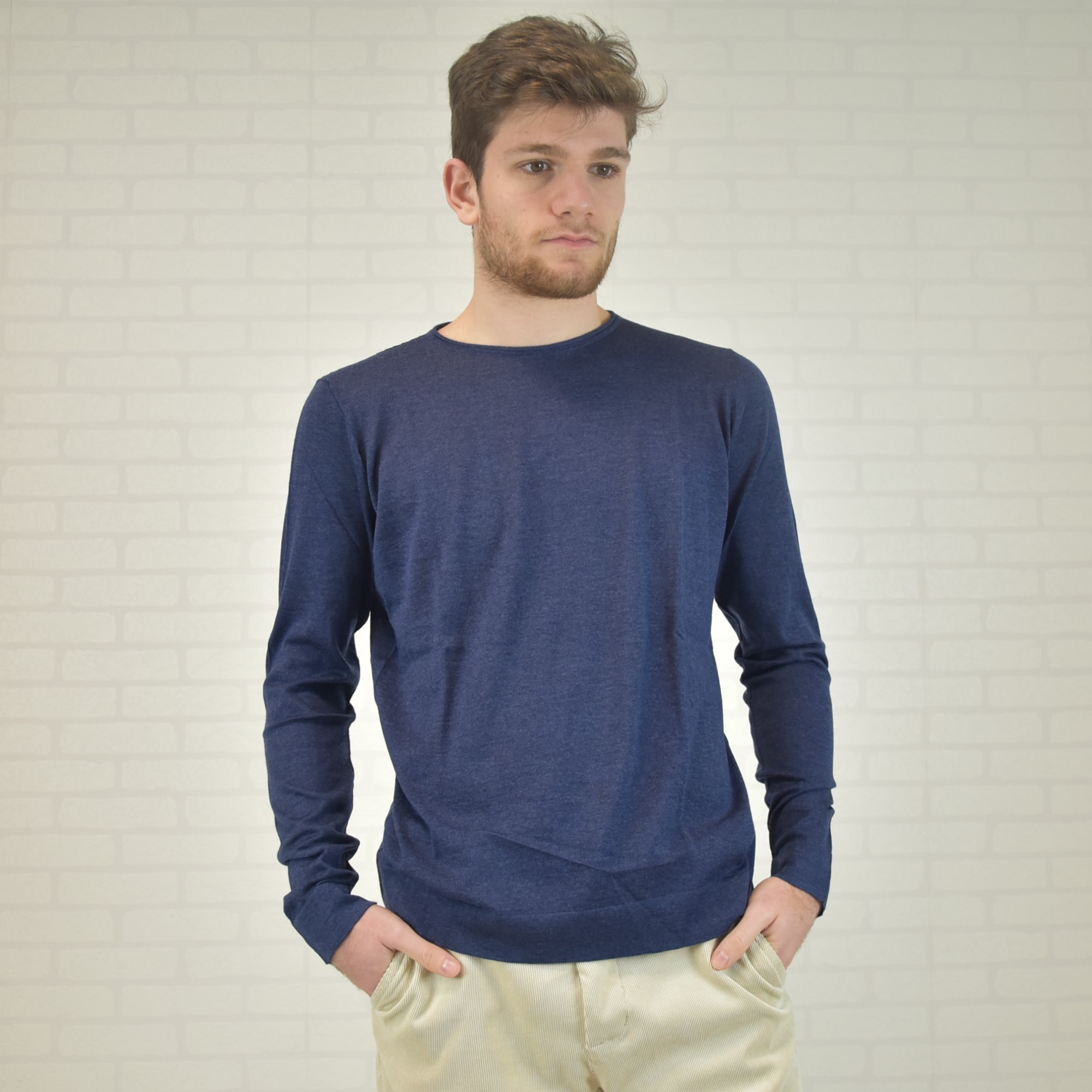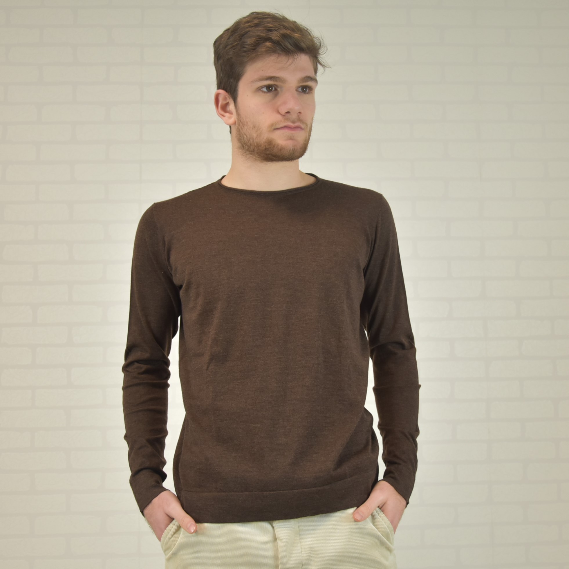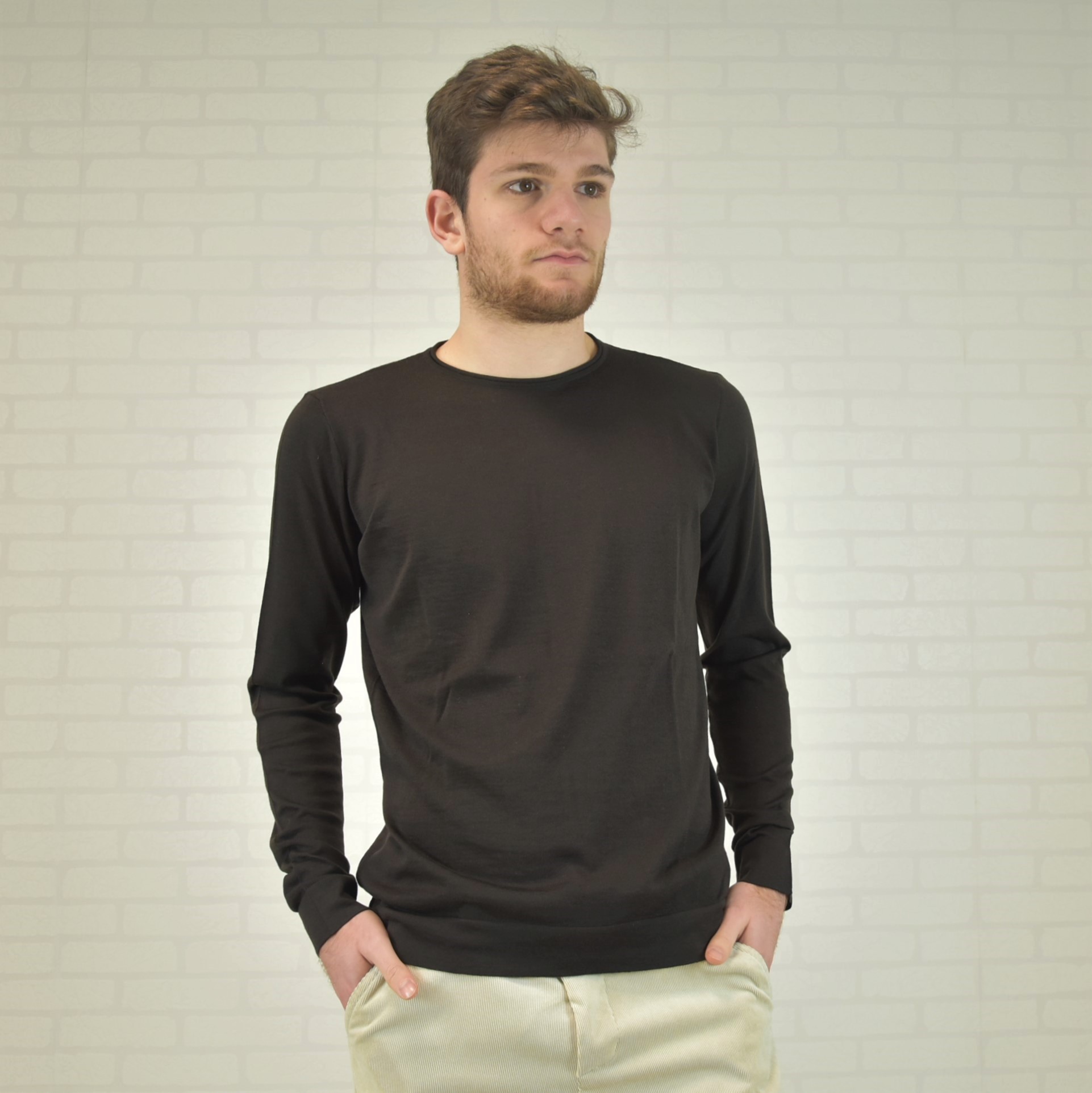 Crewneck sweater with tubular frill and “”curl”” collar 100% cashmere ultralight (knitwear 18 gauge) solid color