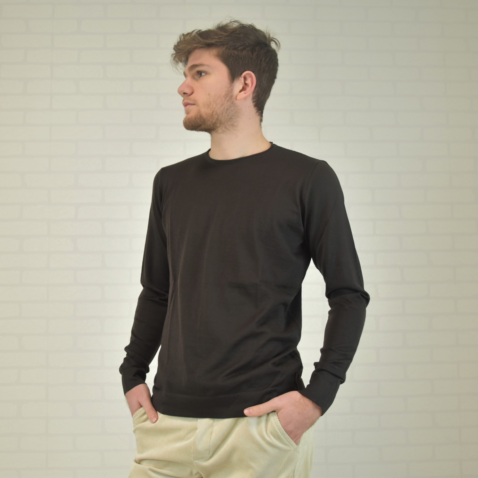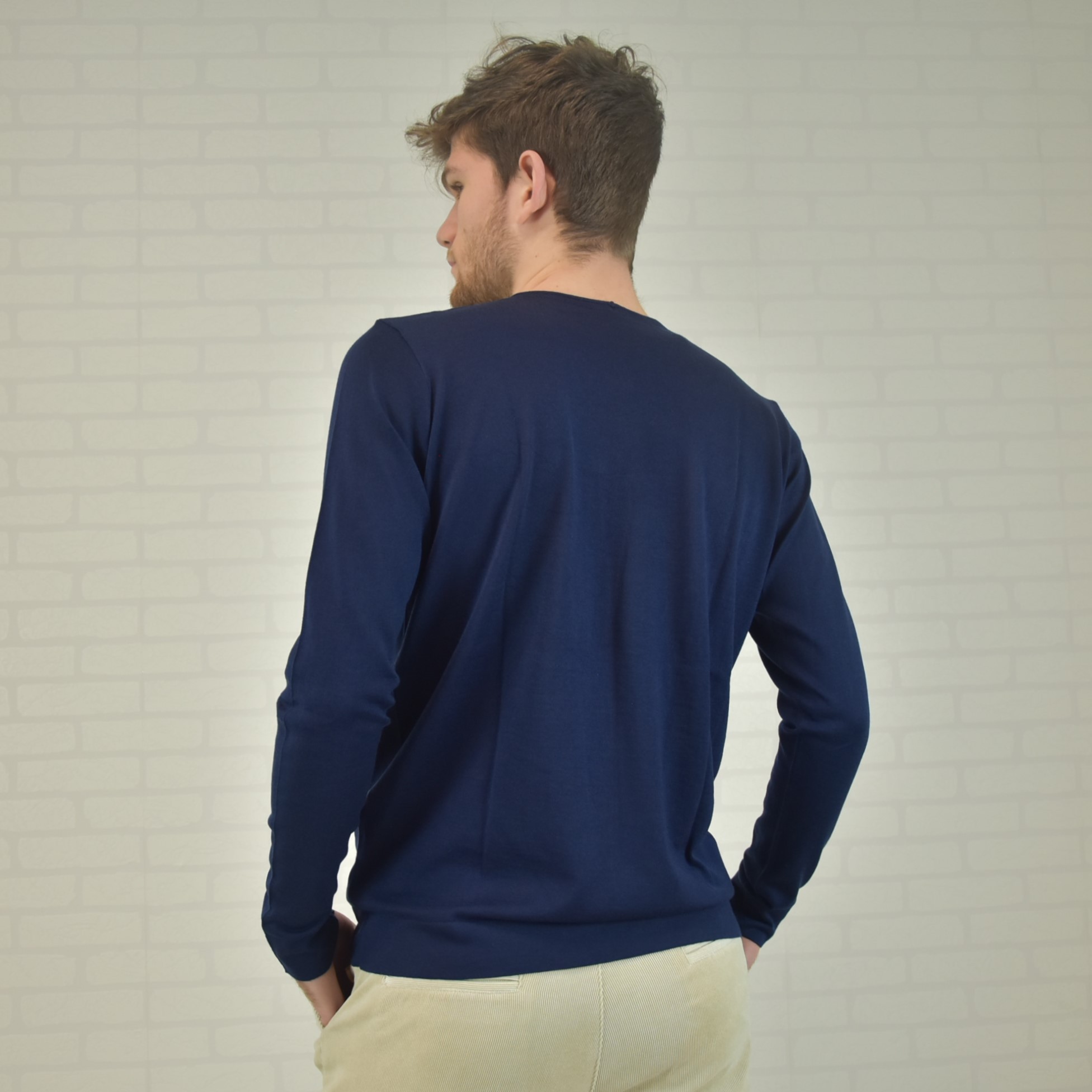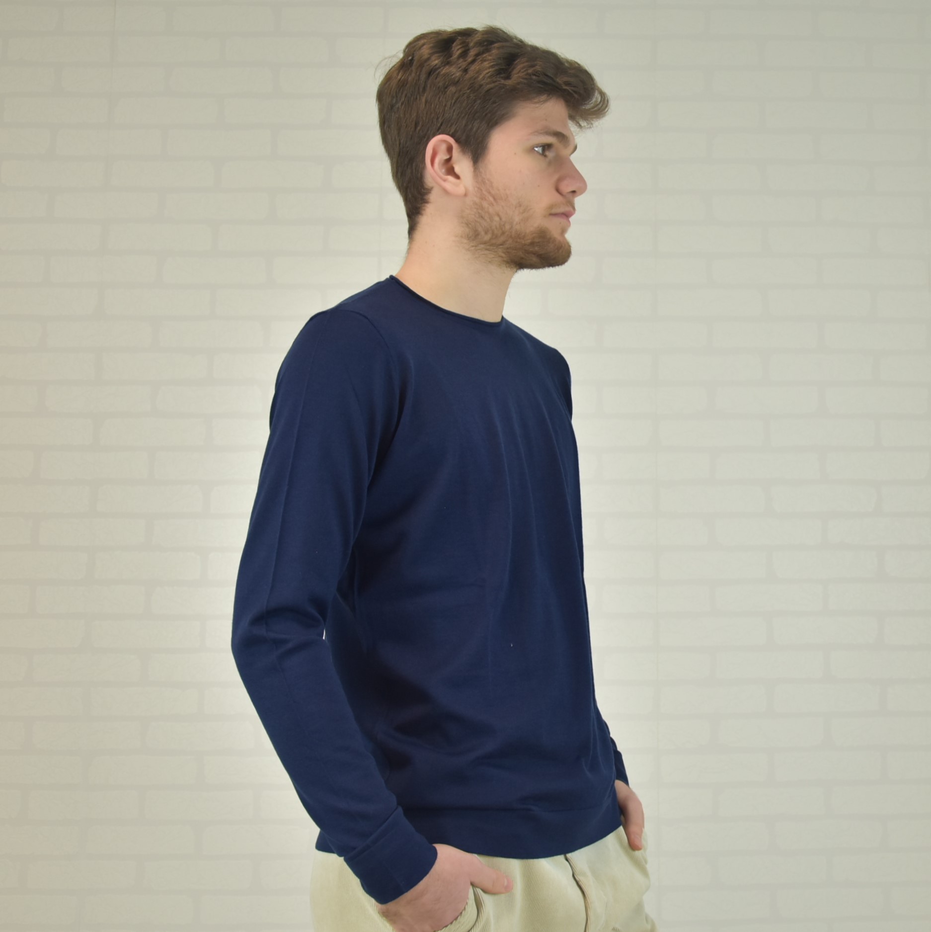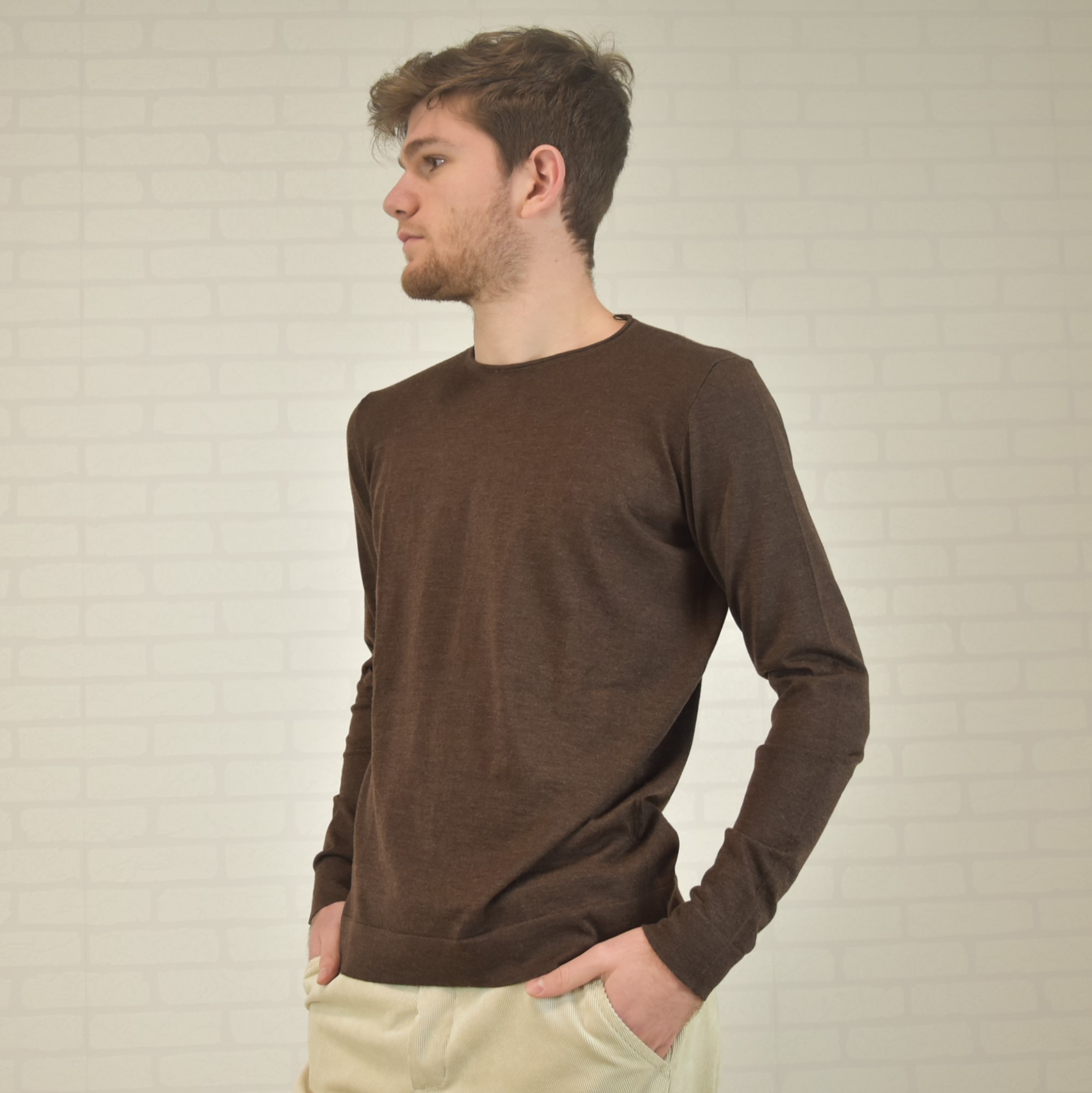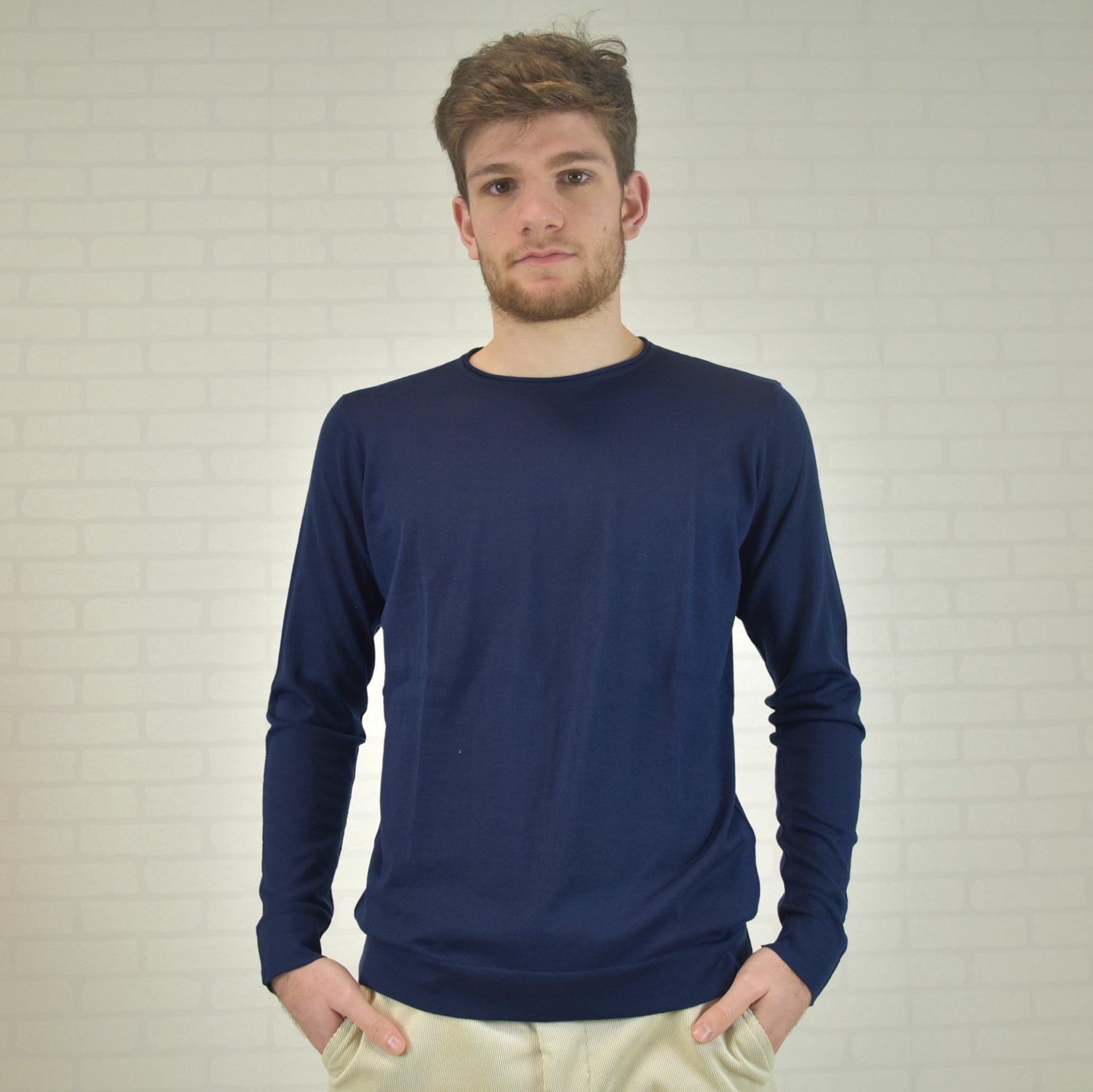 Crewneck sweater with tubular frill and “”curl”” collar 100% cashmere ultralight (knitwear 18 gauge) solid color