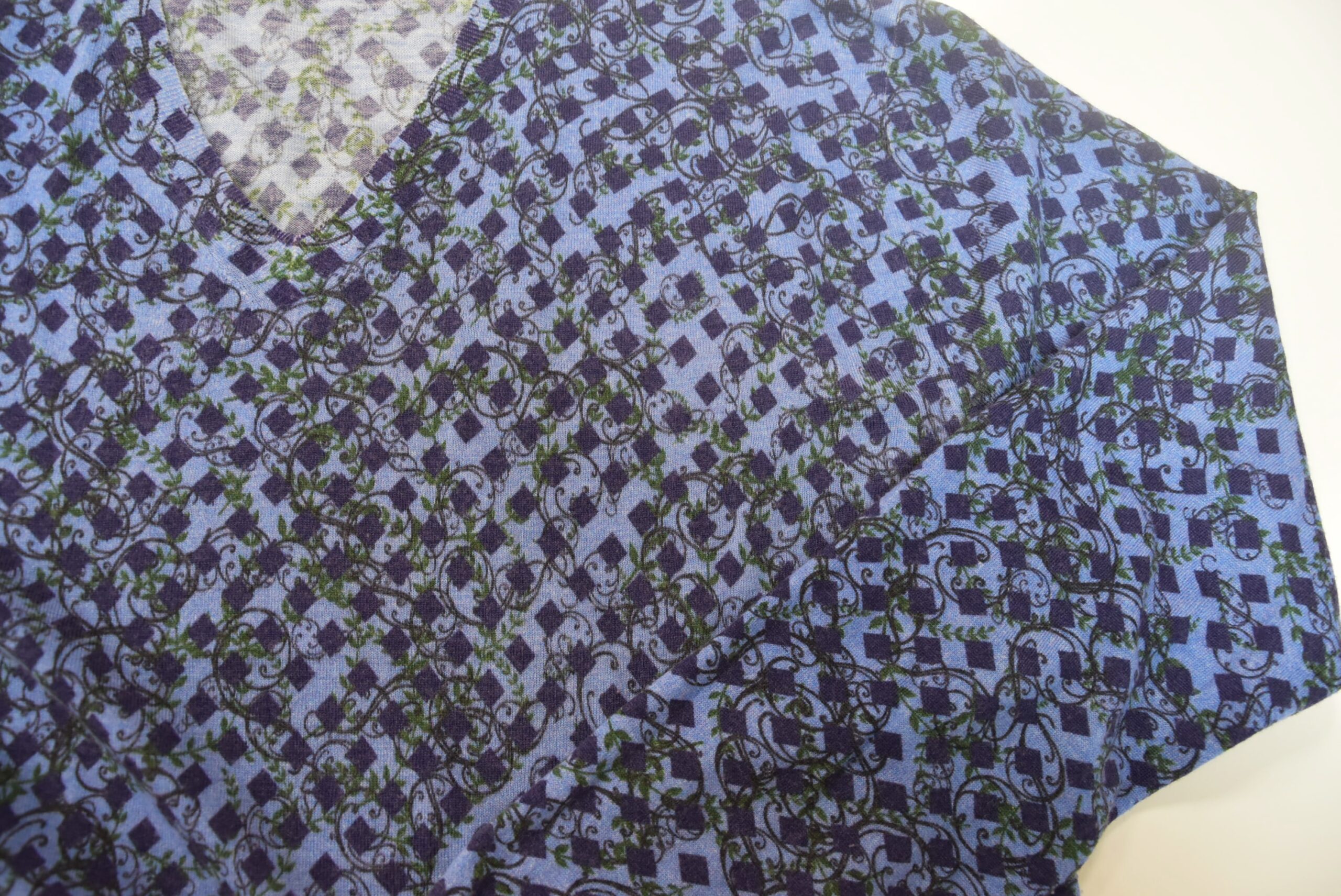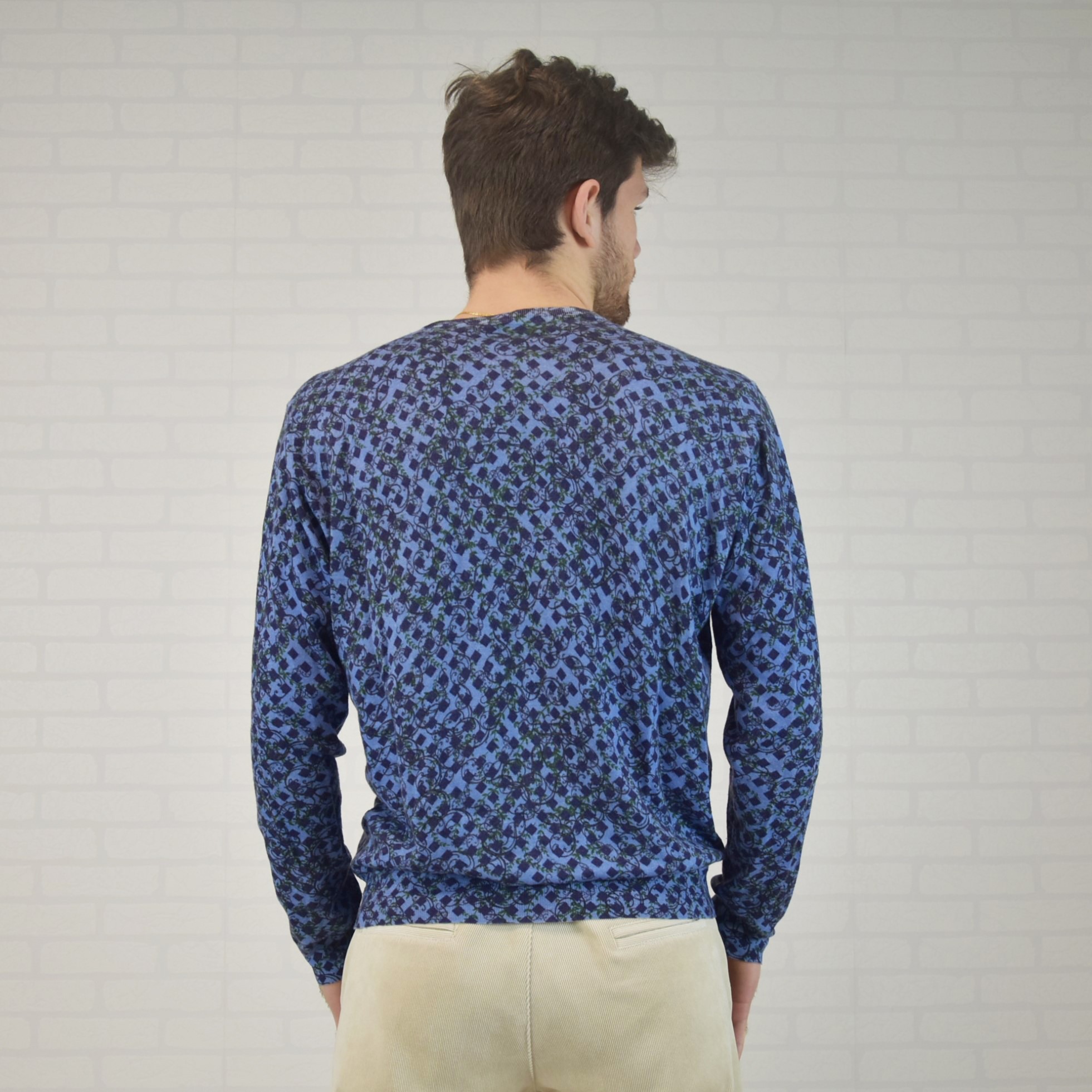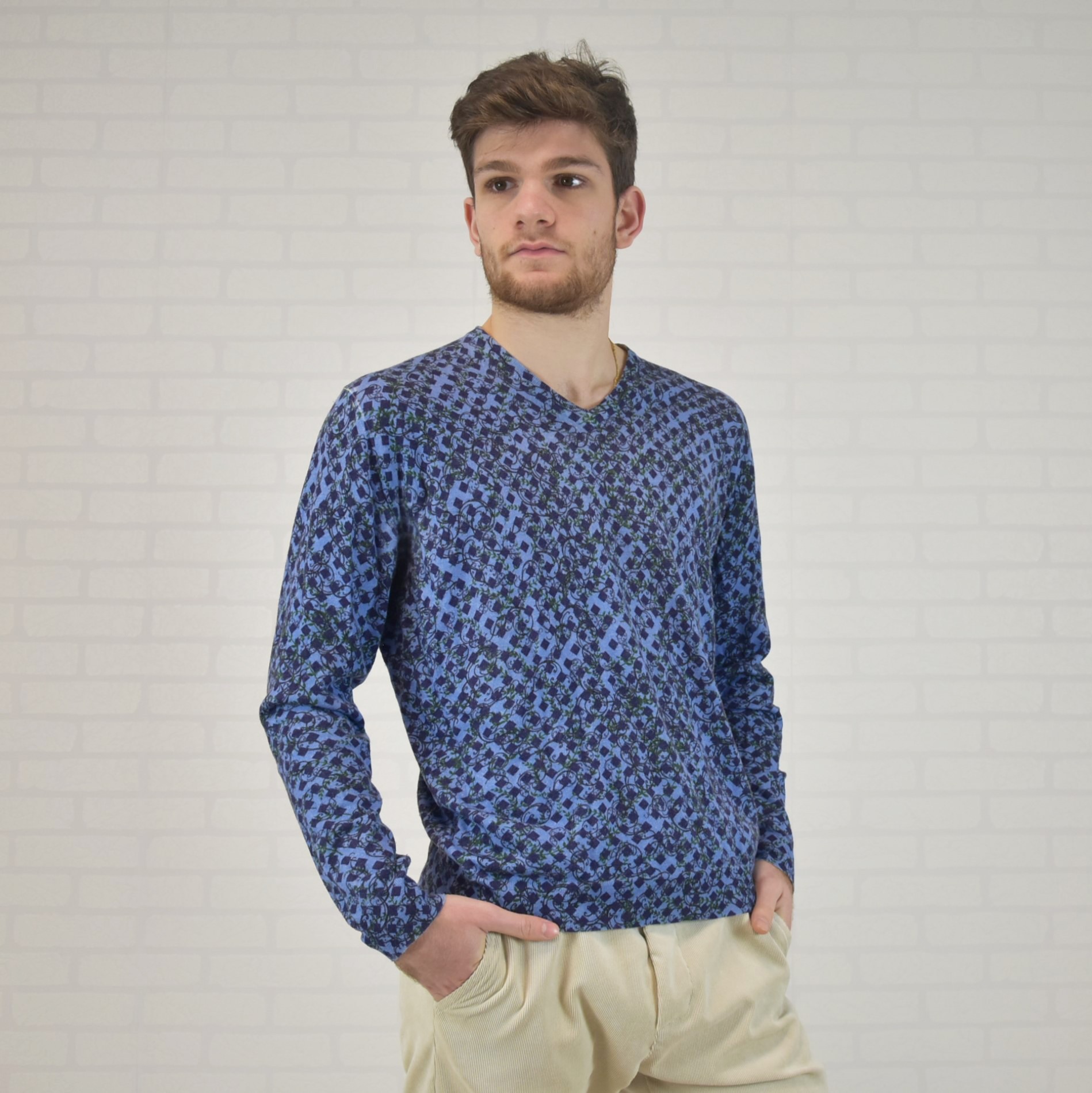 70% cashmere 30% silk ultralight V-neck sweater (knitwear 18 gauge) with all-over digital print (inkjet digital printing)