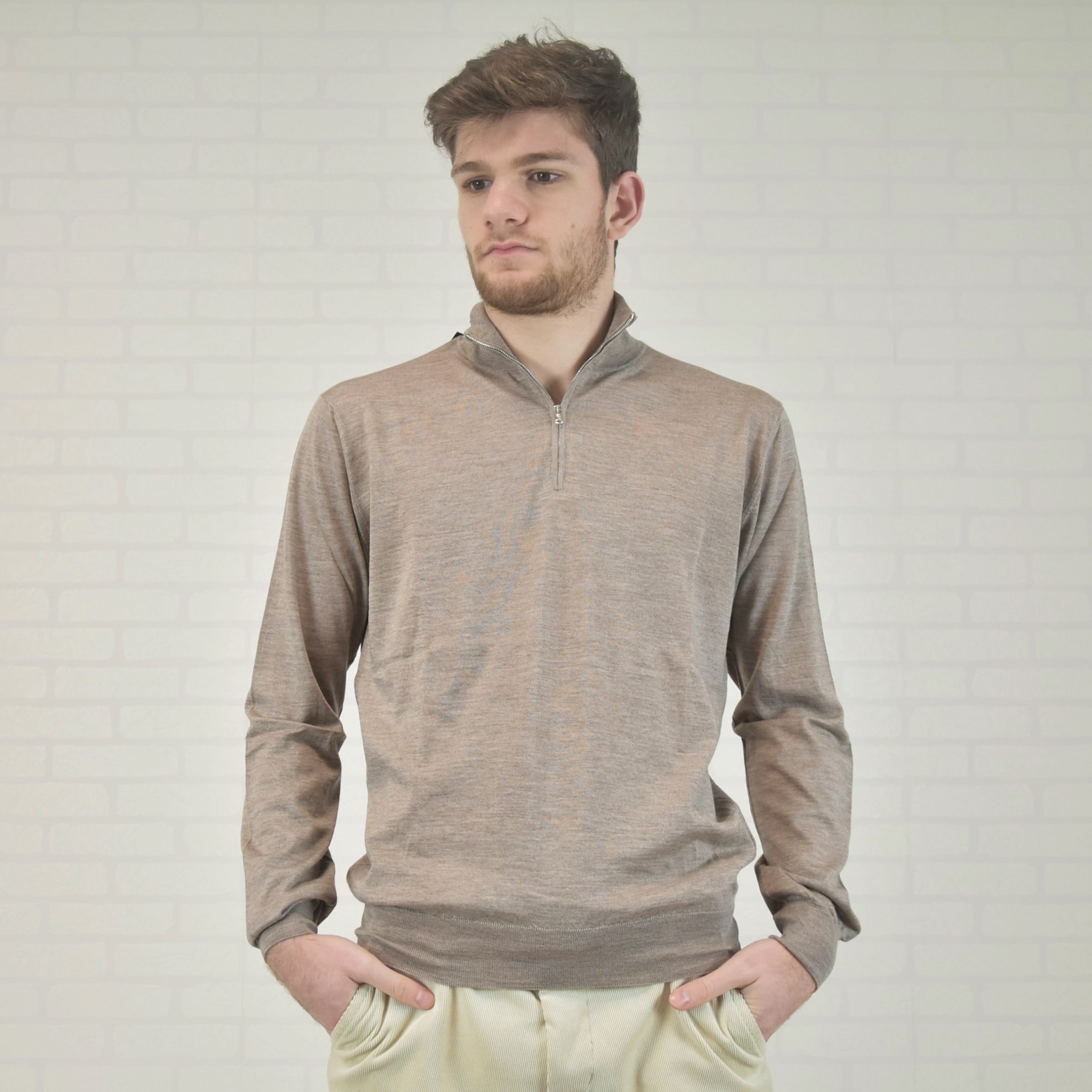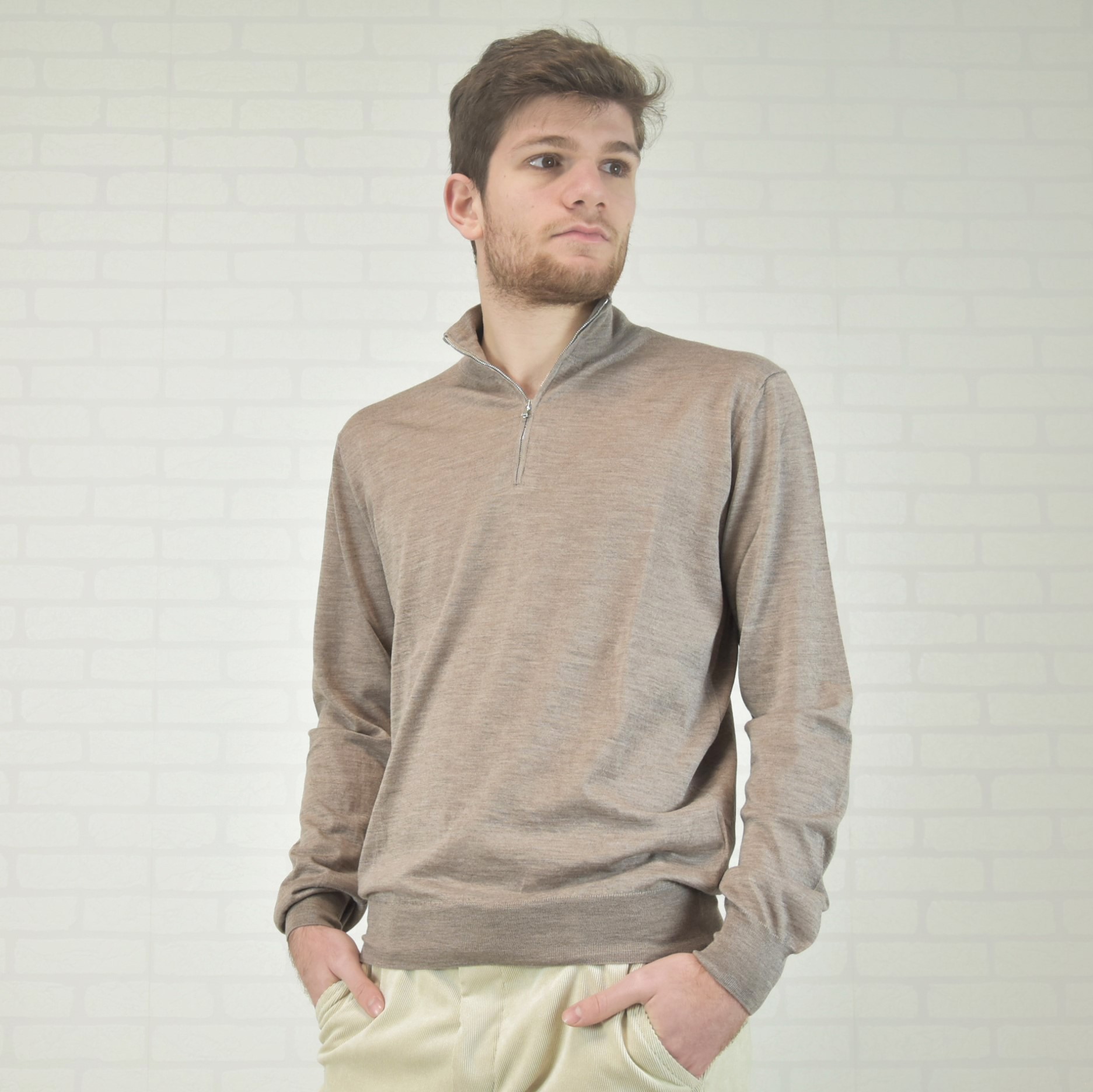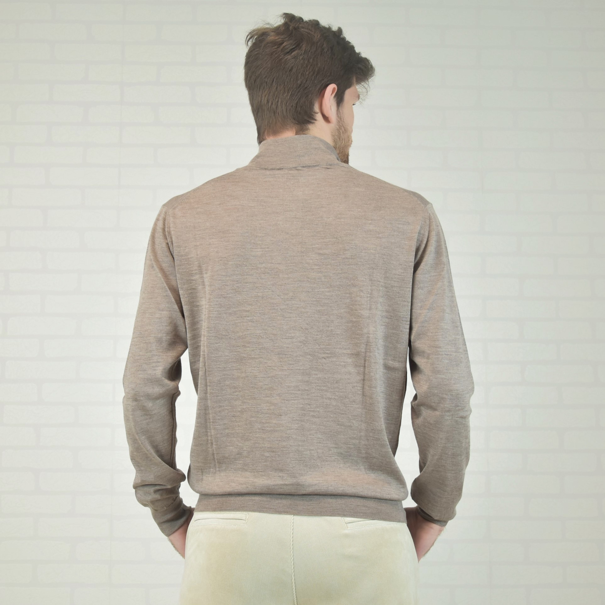 Home / Shop / Knitwear for men / Cashmere-Silk Turtleneck Sweater with Zipper Cashmere-Silk Turtleneck Sweater with Zipper€210,00 Taglia Choose an option4850525456 Colore Choose an optionBeigeClear Cashmere-Silk Turtleneck Sweater with Zipper quantity Add to cart SKU: 3LZ3 Categories: Knitwear for men, Shop, Solid color knitwear Tags: cashmere, cashmere-seta, lupetto, tintaunita Description Additional information Description 70% cashmere 30% silk ultralight solid color turtleneck sweater with zipper Additional information Taglia 48, 50, 52, 54, 56 Colore Beige Composizioni 70% cashmere 30% silk Proprietà Maglieria lavorazione jaquard Related products Wool-Cashmere GEOMETRY Sweater €230,00 Select options Unisex Cashmere Scarf €160,00 Select options STENCIL Cashmere-Silk Stole €180,00 Add to cart Silk COMFORT Camisole €150,00 Select options