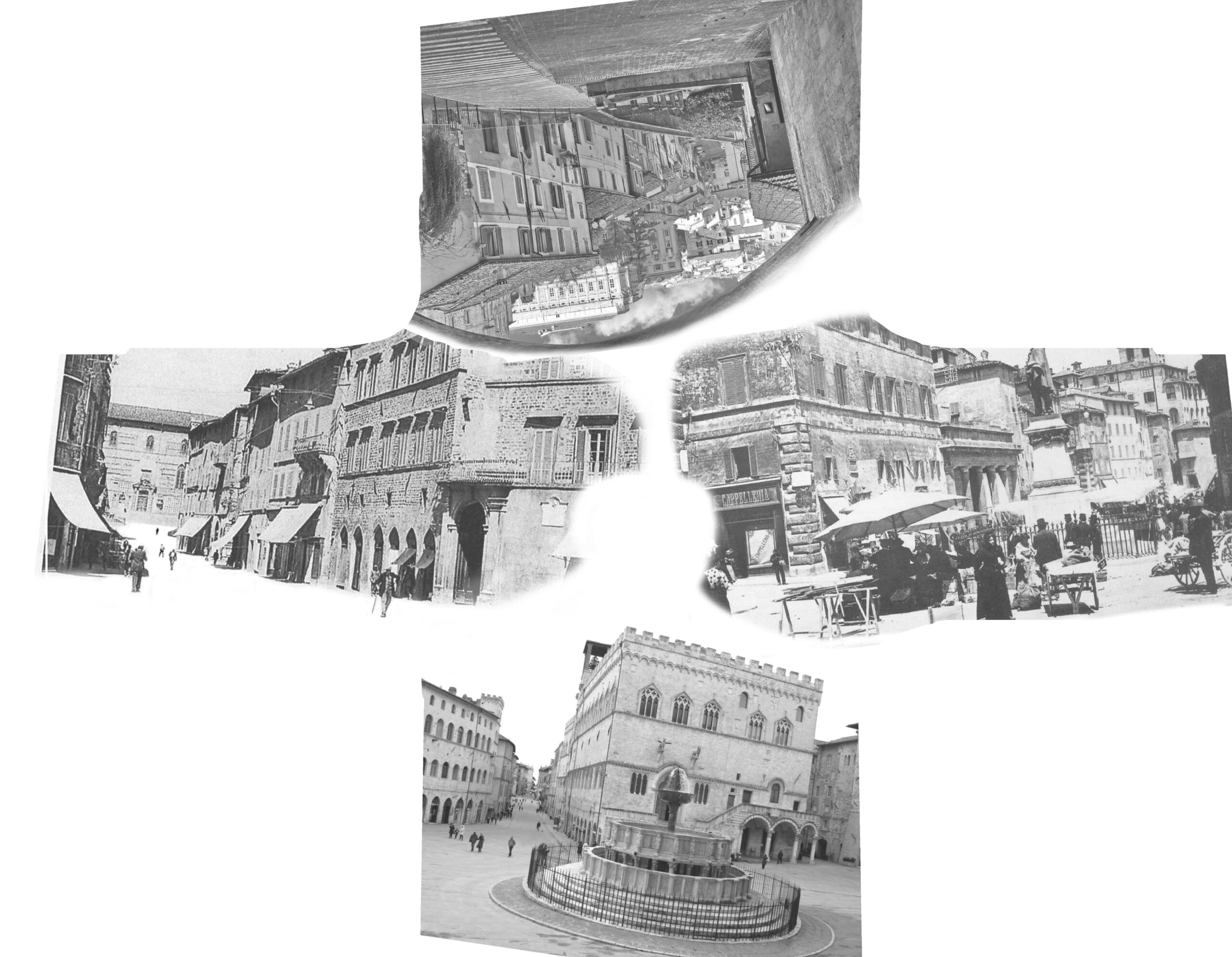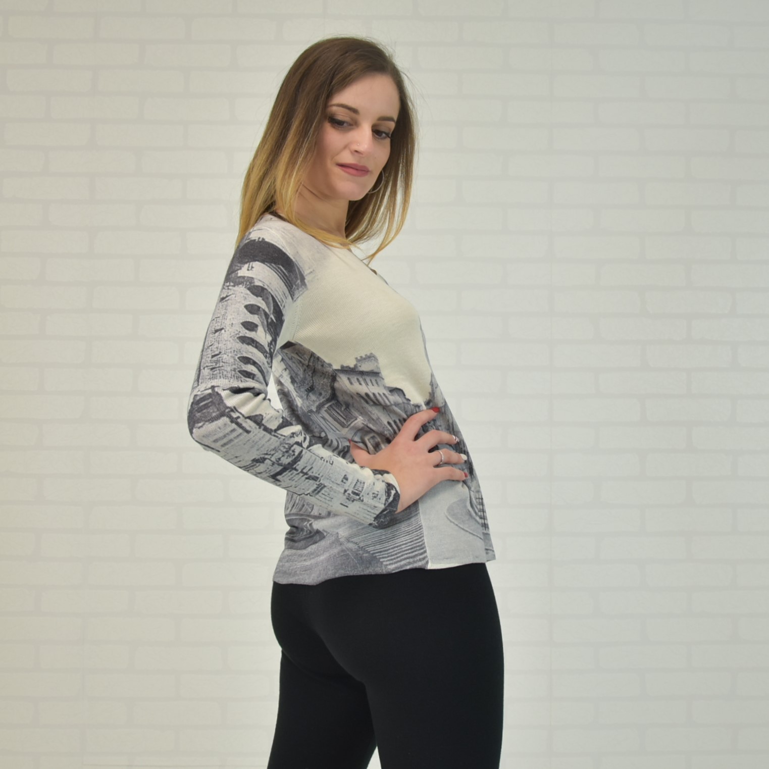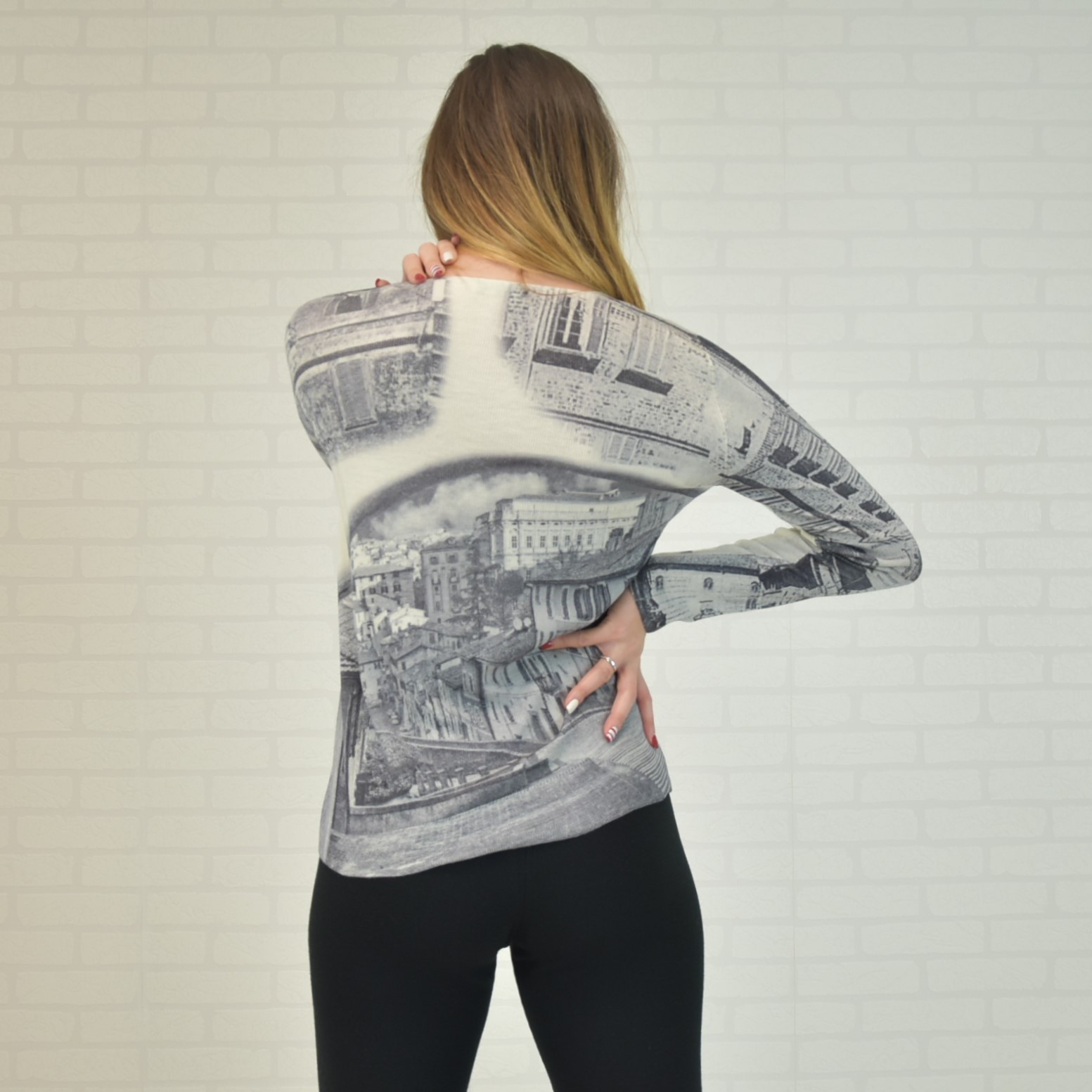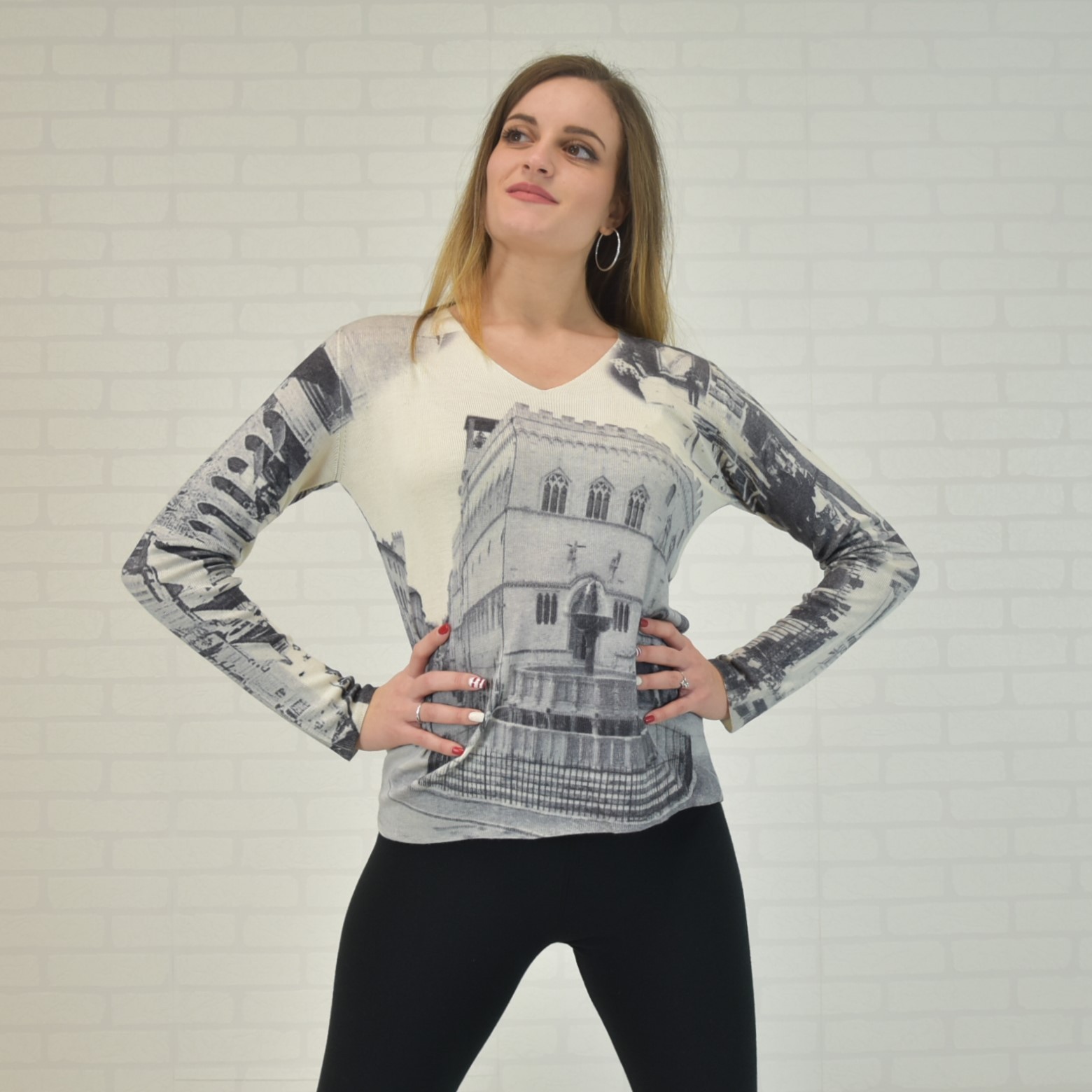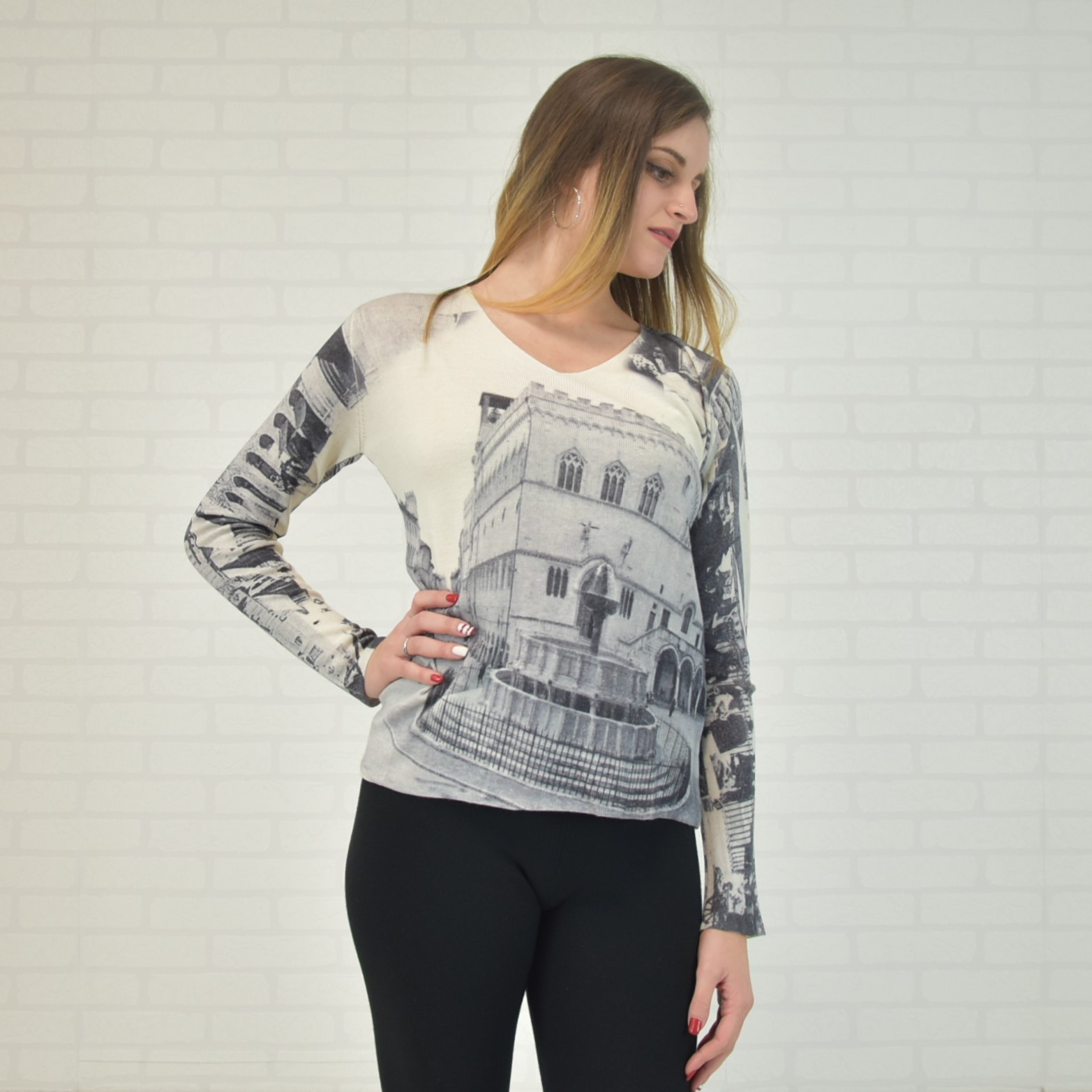 70% cashmere 30% silk sweater (knitwear 18 gauge) with tight stitch, V-neck, and all-over digital print dedicated to our city of Perugia.