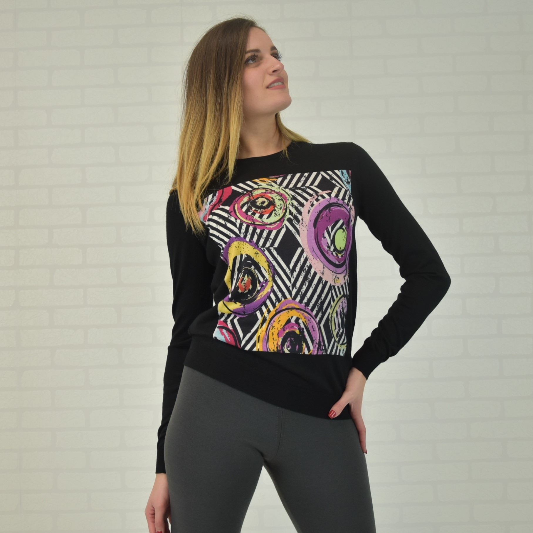 Crewneck sweater 70% cashmere 30% silk ultralight (knitwear 18 gauge) with front digital print (inkjet digital printing)