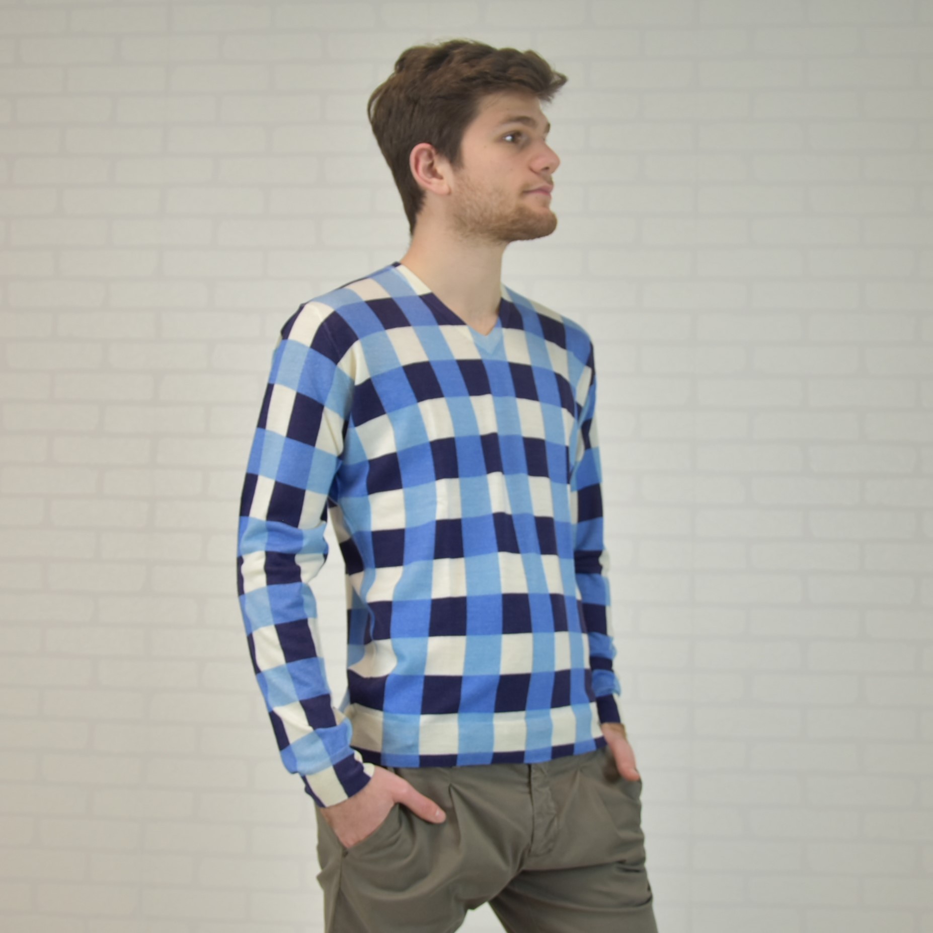 Ultralight V-neck sweater made of 70% wool 30% cashmere (knitwear 18 gauge) with all-over digital print (inkjet digital printing)